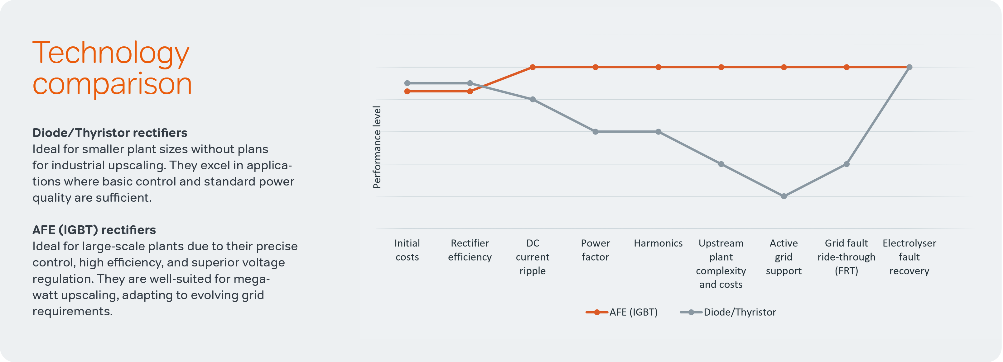 From a grid compliance perspective, diode rectifiers are reasonable when power quality demands are low. However, as plant size increases, integrating diode rectifiers becomes more complex, shifting costs from the rectifier to transformers, filters, and control systems.